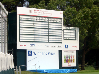 しかし、もし自分がラウンド中であったら携帯電話を使って順位を確認することはできません。気になる上位陣の争い。そんな時、コース内の数箇所に配置されたスコアボードに目をやります。